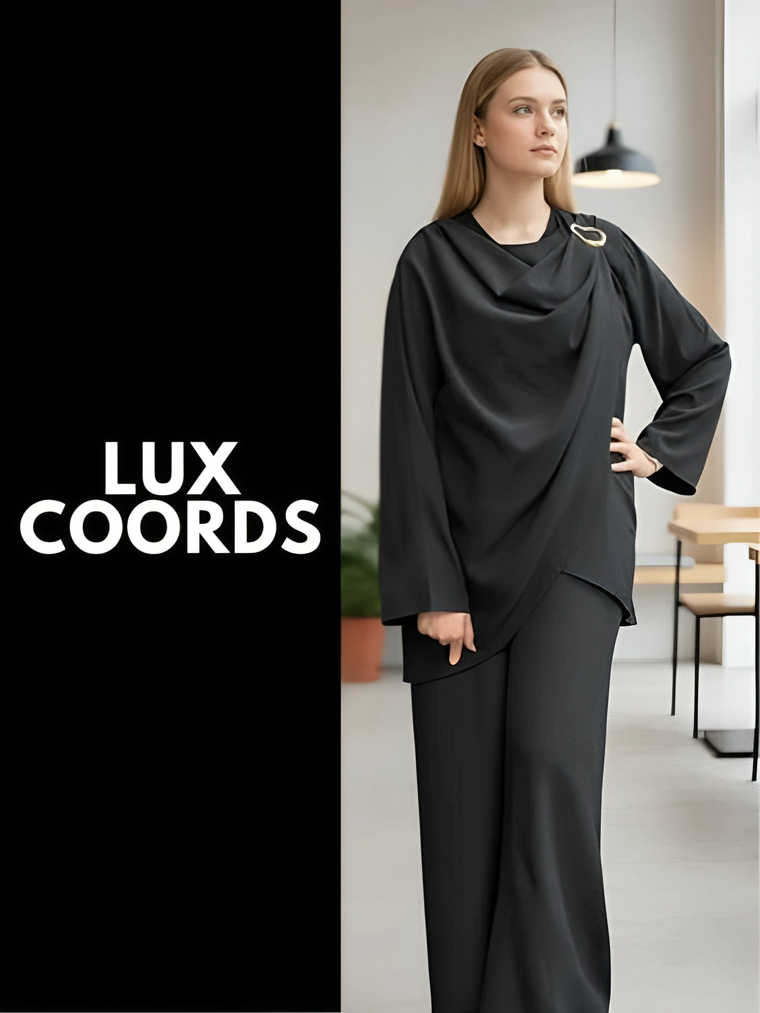 Black Draped Side Buckle Co-Ord Set | Elegant Contemporary New Arrival Outfit