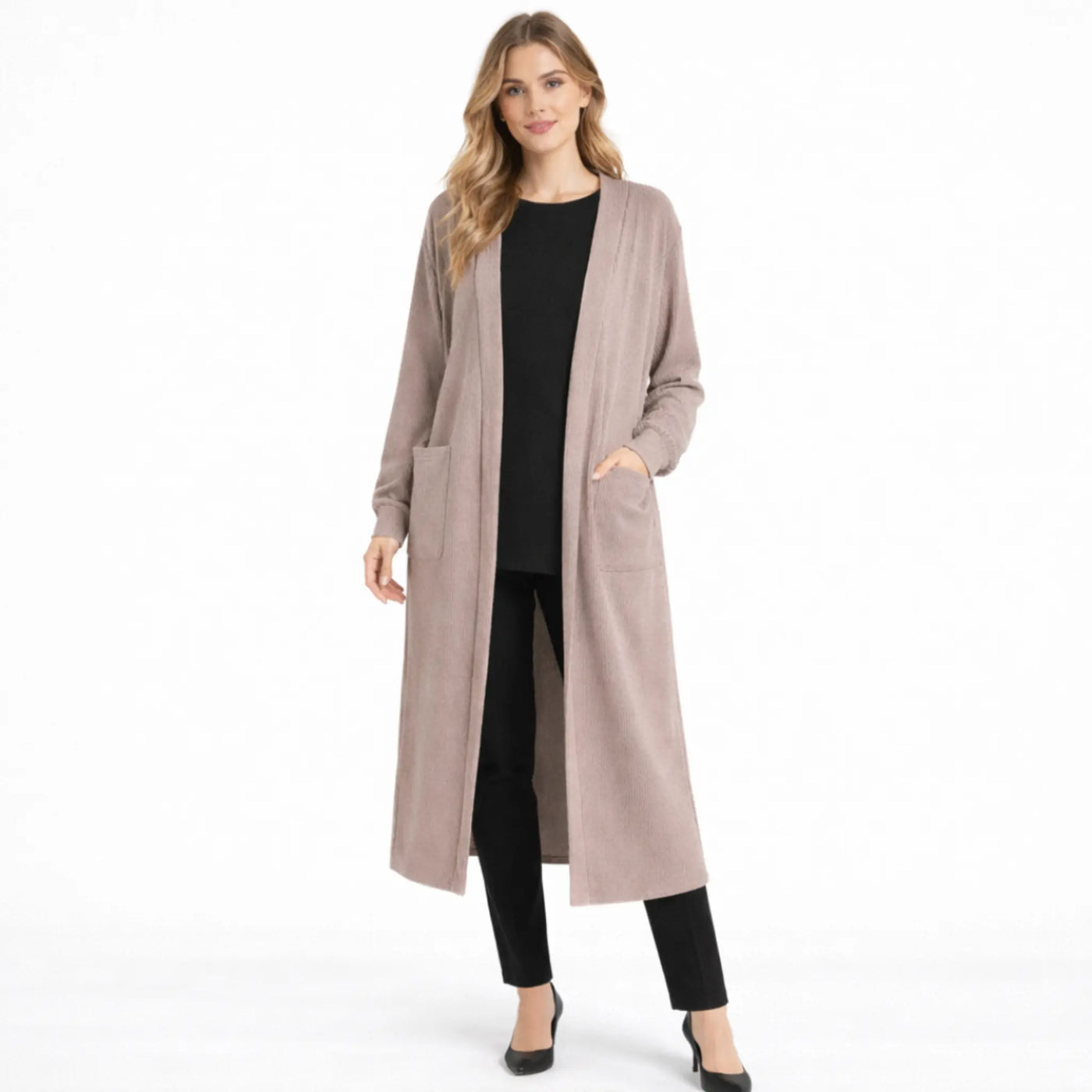 Women’s Long Ribbed Open Front Cardigan with Pockets | Casual Everyday Layering Coat - One Size 8 - 18 / light gray