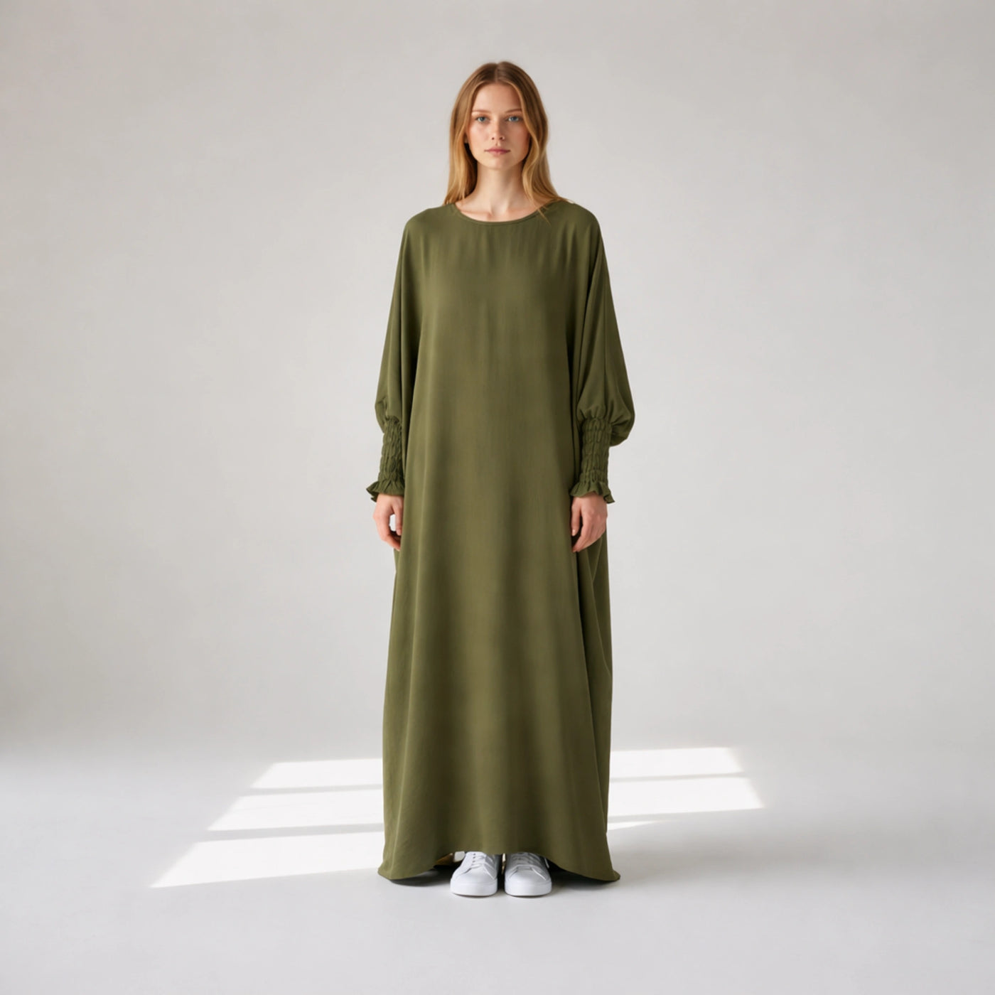 Crepe Elastic Sleeve Dress | Elegant Comfortable Fit for Work & Formal Wear - Olive Green / One Size Fits 10-16