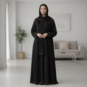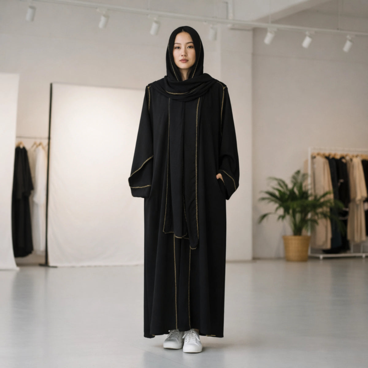 Designed with meticulous contrast stitching, it adds a contemporary touch to a timeless abaya style, seamlessly balancing traditional modesty with modern detailing. Ideal for both formal occasions and everyday wear, this abaya is durable, easy to maintain, and tailored to perfection.