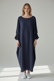 This crepe dress features elastic sleeves that offer a comfortable fit and ease of movement. The delicate crepe fabric drapes elegantly, providing a refined silhouette suitable for both professional and formal occasions. Its versatile design blends style with functionality, making it an excellent choice for a polished wardrobe.